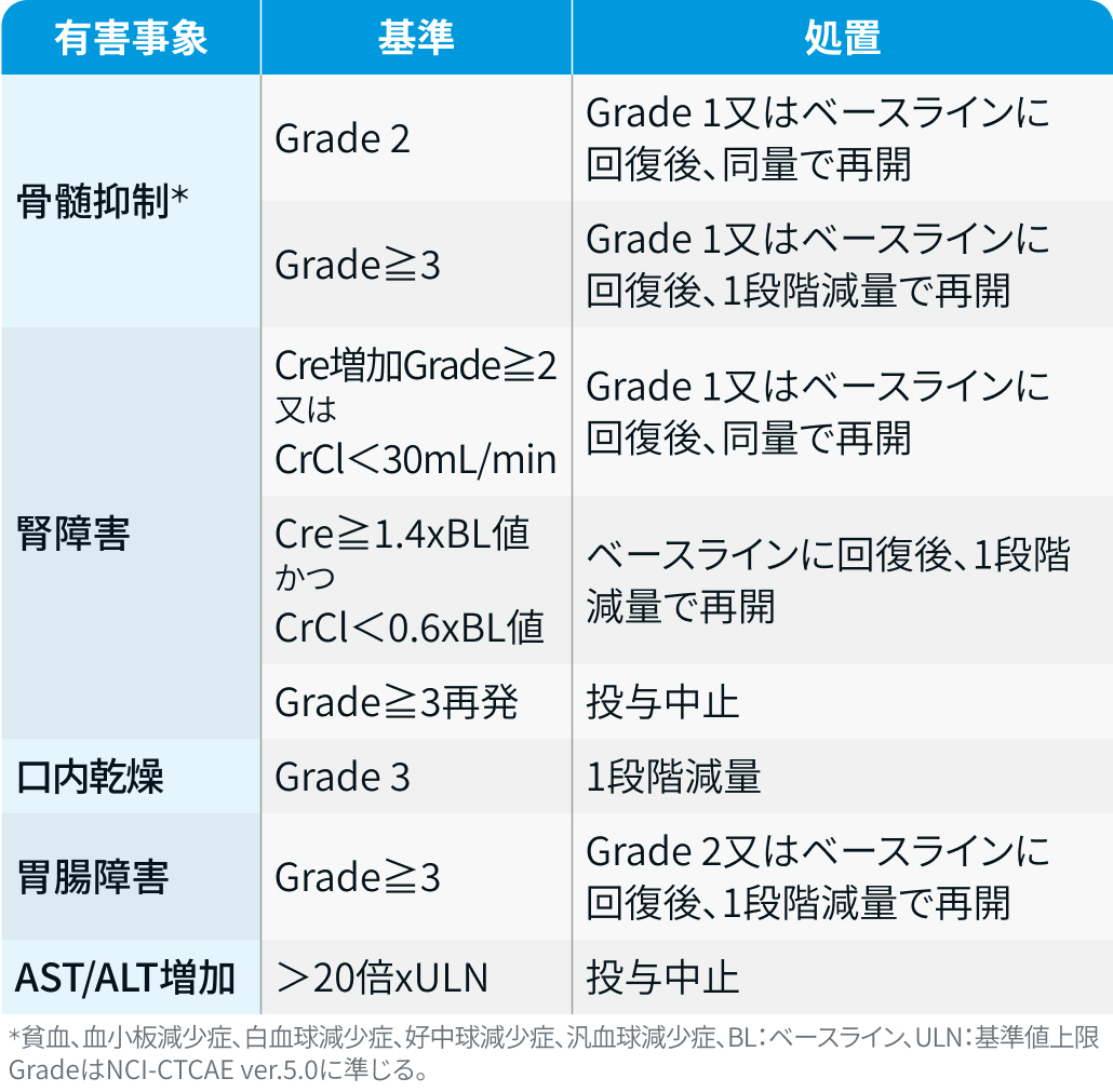 VISION試験³⁾では、 減量は1回のみ許可され再増量は不可であり、 追加の減量が必要な毒性が出た場合や有害事象による投与遅延が4週間を超える場合は治療を中止するとされた。