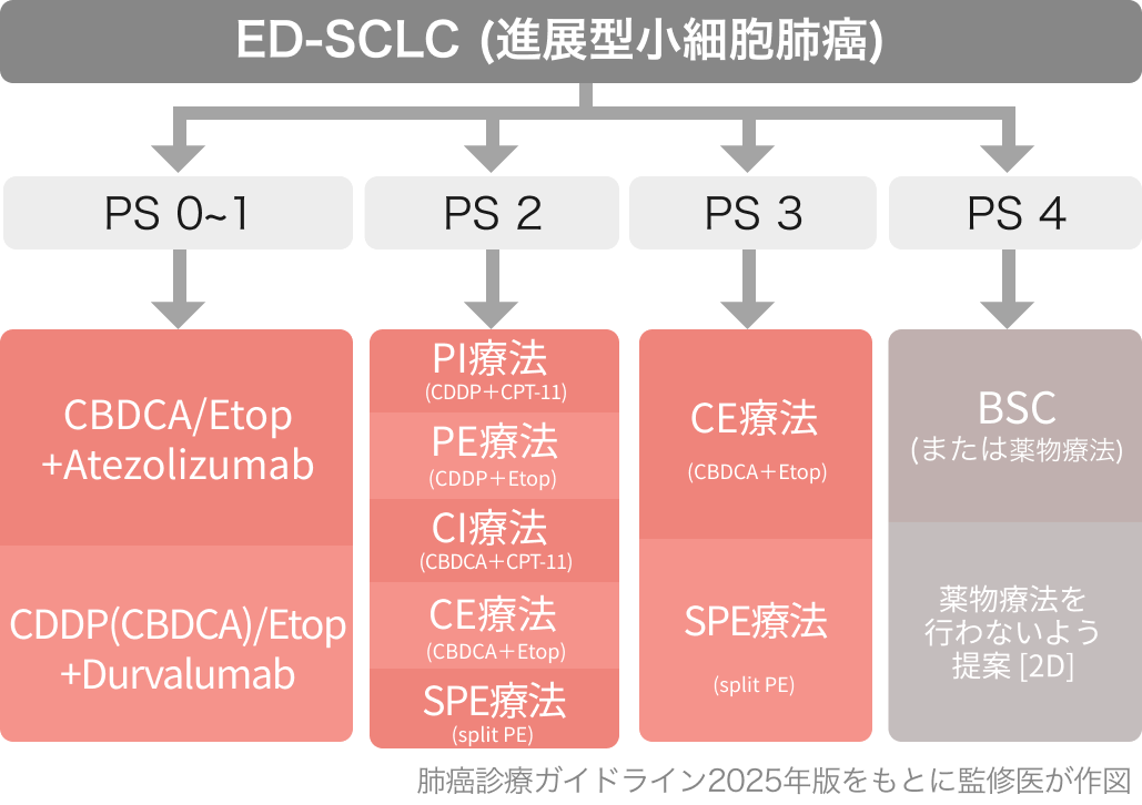 ED-SCLCは根治不能であり、 患者のQOL改善と生存期問延長を重視した選択が重要。 PS良好例では、 第一選択として以下の理由から白金製剤併用+ICIが挙がる。 ICIが併用できないときや、間質性肺疾患合併時にはIP療法またはPE療法が候補となる。