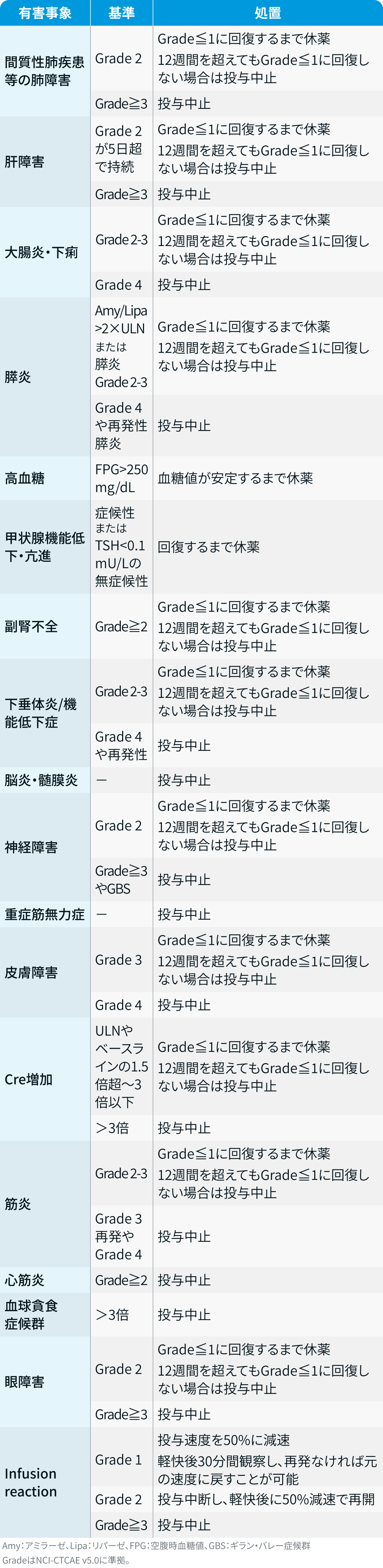 甲状腺機能障害、 副腎機能障害、 下垂体機能障害 : 投与開始前および投与期間中は、 定期的に内分泌機能検査 (TSH、 遊離T3、 遊離T4、 ACTH、 血中コルチゾールなど) を行う。 必要に応じて画像検査の実施も考慮する。