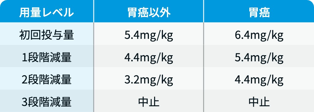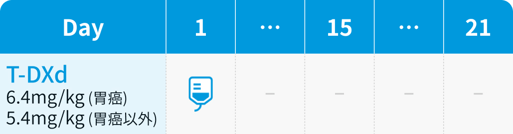 トラスツズマブ デルクステカン (T-DXd) : 5.4mg/kg (胃癌では6.4mg/kg) を3週間ごとにDay 1に90分かけて点滴静注する。 初回投与の忍容性が良好であれば、 2回目以降は30分まで短縮可。