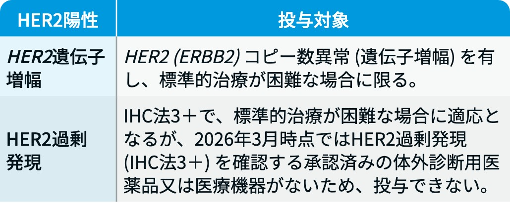 本剤の適応判定 (HER2 [ERBB2] 遺伝子増幅) に利用可能なコンパニオン診断薬は以下のとおり。