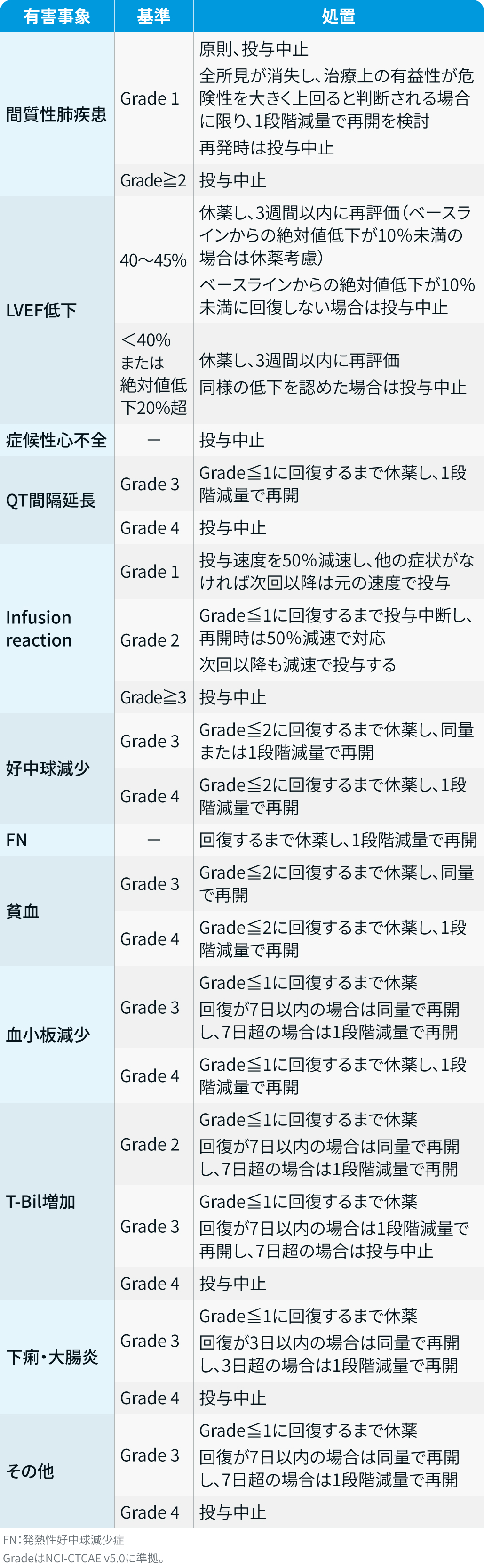 心毒性 : LVEF低下の可能性があるため、 投与開始前に心機能を確認。 投与中は心症状や重症度に応じて心エコー等を適宜実施し、 LVEF変動を含めた状態を観察のうえ、 休薬・再開・中止を判断する。