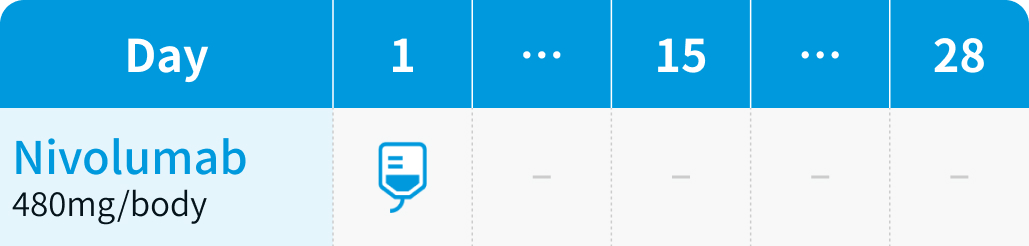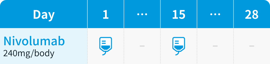 通常、 成人にはニボルマブ240mgを2週間毎又は480mgを4週間毎に点滴静注