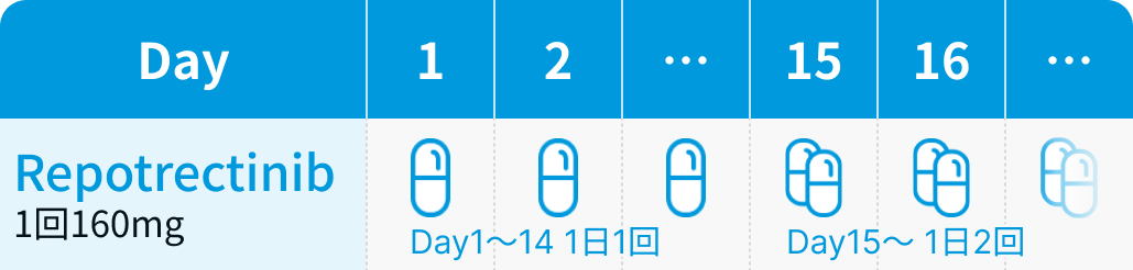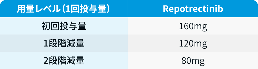 成人に対して、 1日1回160mgを1日1回14日間経口投与し、 その後160mgを1日2回に増量。 開始14日間で忍容性が認められない場合、 1日2回投与に増量しない。