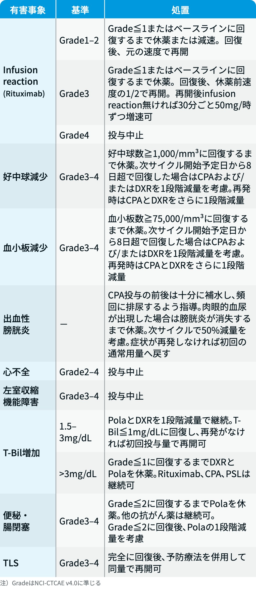 | Polaの初回投与で前投与を行わずにinfusion reactionが認められた場合、 以降はPola前に前投与を行う. |