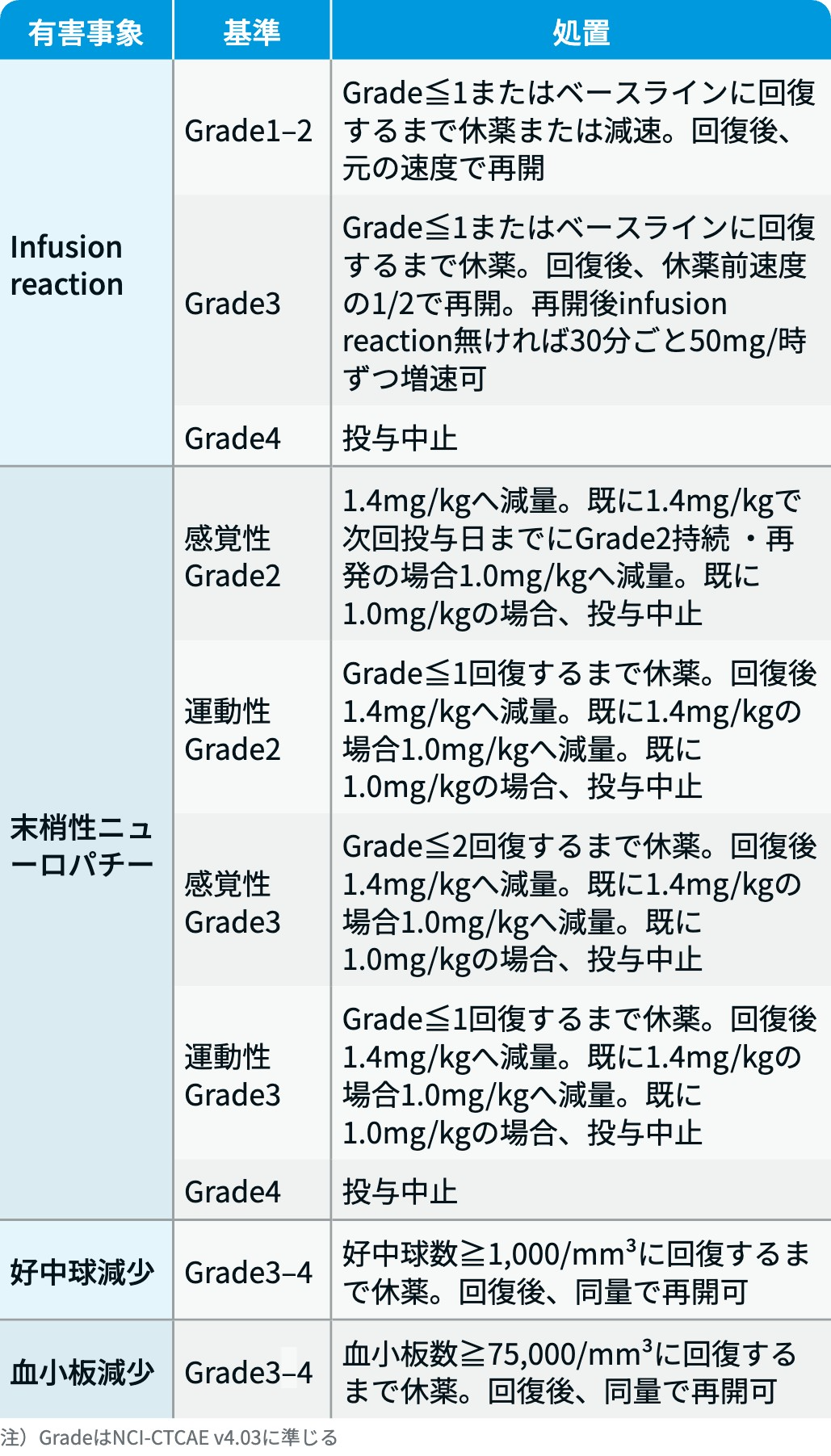 骨髄抑制 : 好中球減少、 発熱性好中球減少症、 貧血、 血小板減少、 白血球減少、 リンパ球減少等があらわれることがあるため、 定期的に血液検査を行い、 G-CSF製剤の適切な使用を考慮すること。