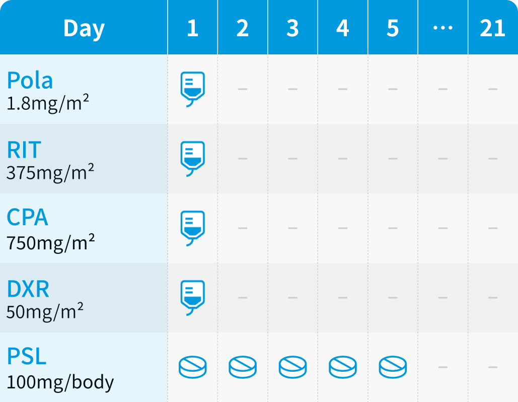 ポラツズマブ ベドチン (Pola) : 1.8mg/kgを1日1回点滴静注し、 3週ごと (Day 1) に投与