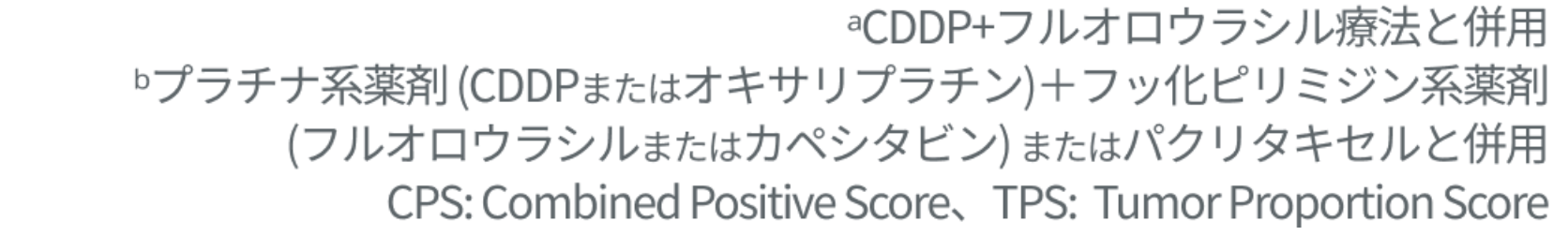 チスレリズマブは、 シスプラチン+フルオロウラシルとの併用による3週毎投与レジメンとして承認されている。 RATIONALE-306試験で用いられた他の化学療法レジメンとの併用は、 承認対象外である点に注意する。