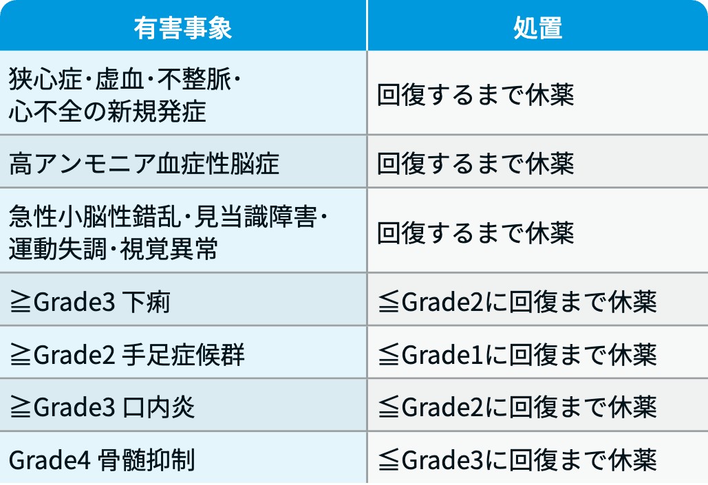 主要論文や適正使用ガイドをもとにした用量調整プロトコール、 有害事象対応をご紹介します。