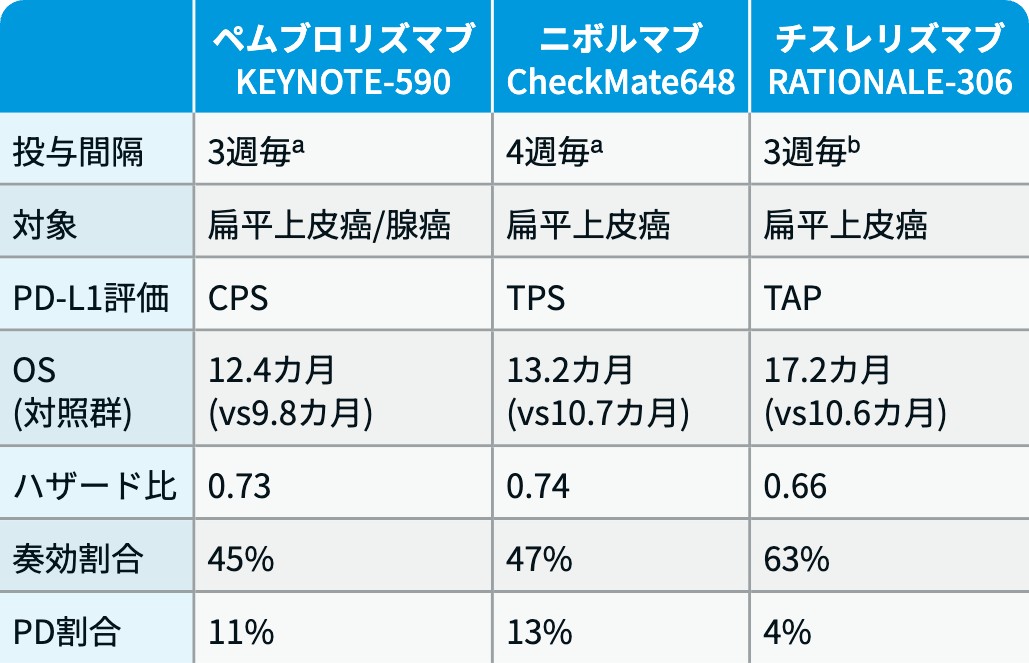 チスレリズマブに先行して臨床応用されているICI併用化学療法との比較は以下の通りである。