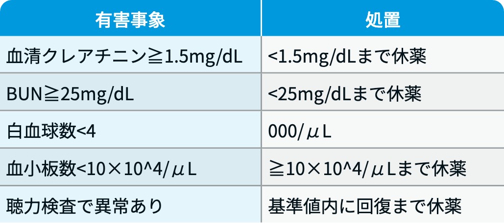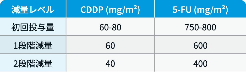 次回投与日までにGrade 0~1まで回復しない副作用が認められた場合は、 以下のとおりFPの減量を行う。 ただし、 5-FUおよびCDDPに個別に設定された休薬基準もあわせて参照すること。