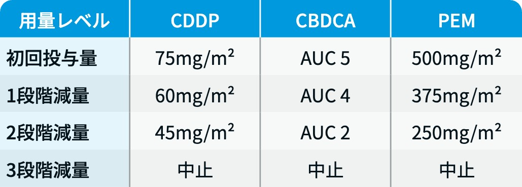 白金剤 : シスプラチン (CDDP) 75mg/m²またはカルボプラチン (CBDCA) AUC 5mg/mL/minを点滴静注し、 3週ごとに投与