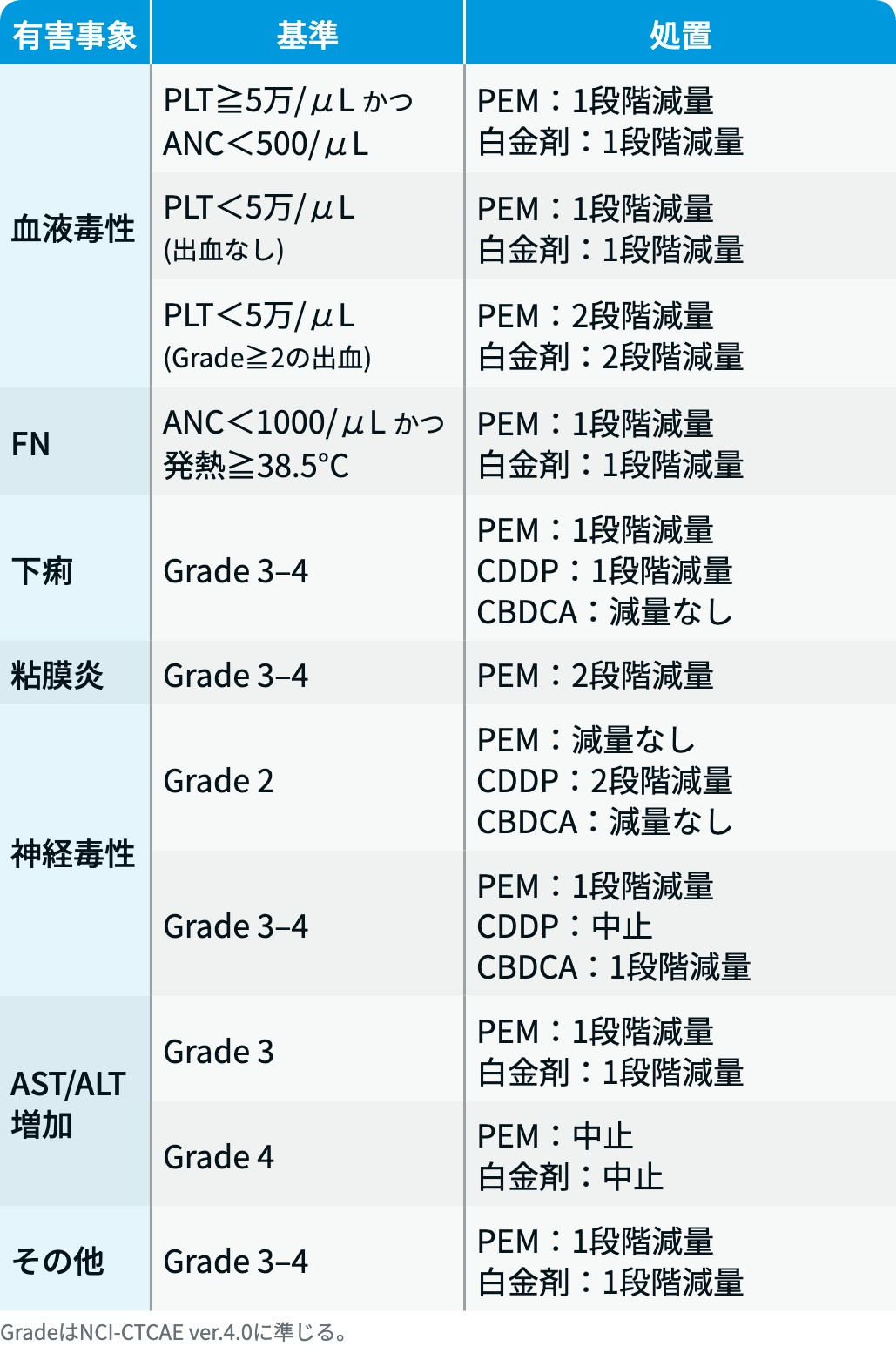 PEMの副作用予防 : 重篤な副作用を軽減するため、 初回投与7日以上前から葉酸0.5mgを1日1回連日経口投与し、 最終投与日から22日目まで可能な限り継続する。 ビタミンB12は初回投与少なくとも7日前に1mgを筋肉内投与し、 投与期間中および中止後22日目まで9週ごと (3コースごと) に追加投与する。
