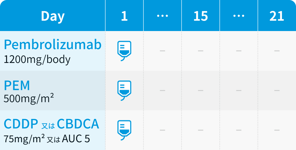 白金剤は4コースまで投与。 以降は維持療法として、 PEMを病勢進行または忍容不能な毒性まで継続。 ペムブロリズマブは病勢進行または忍容不能な毒性まで投与し、 投与回数は最大35回まで。