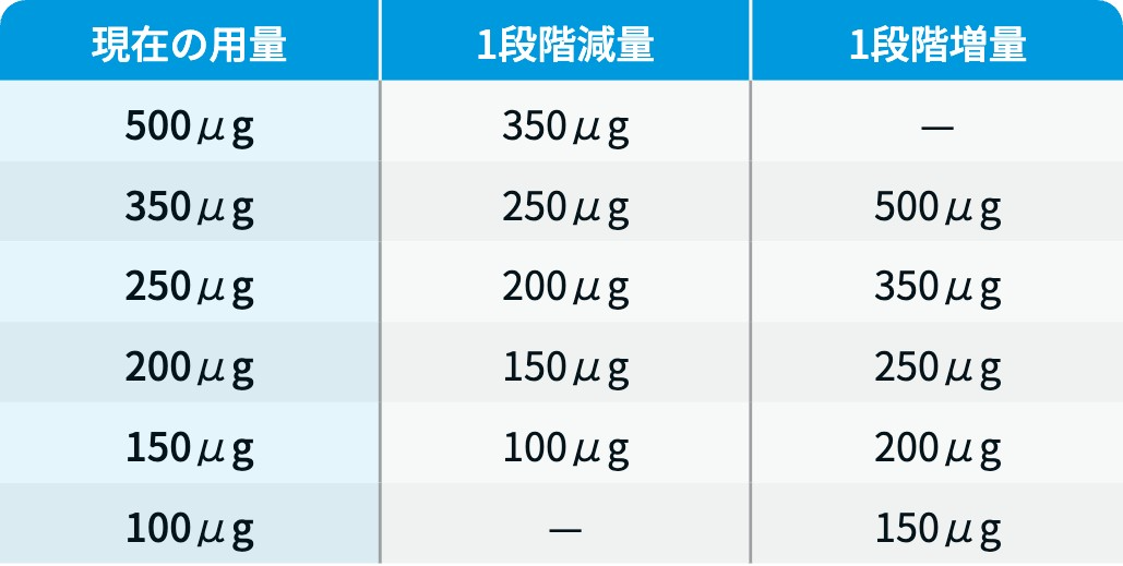 A法で投与する場合は50μgずつ増減し、 B法で投与する場合は、 下表に従い増減する。