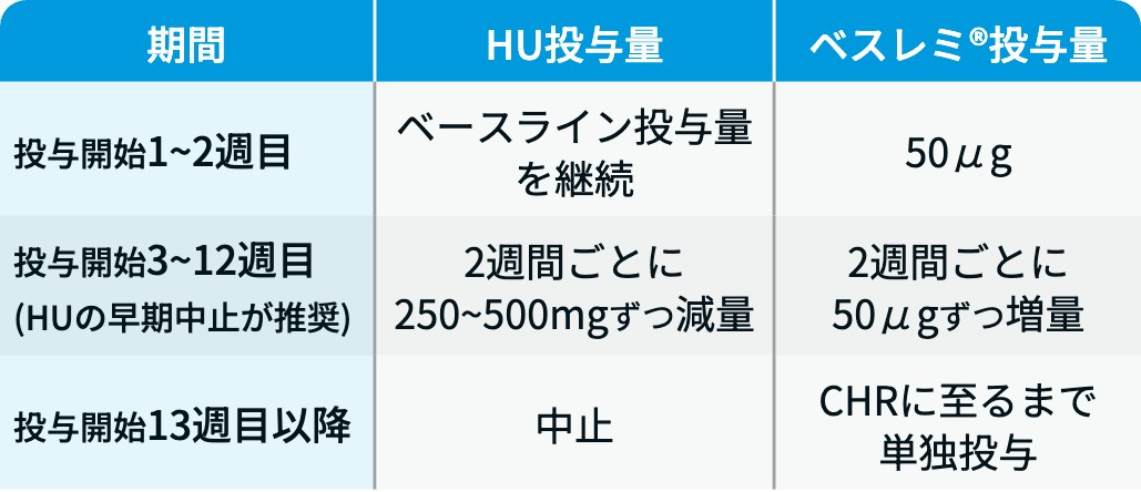 - HU治療歴がある場合は、 ノンレスポンダーで、 治療期間が3年未満、 かつHU抵抗性または不耐容ではない患者
