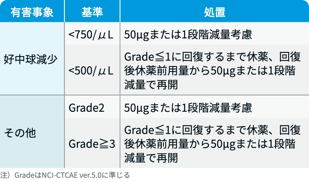 A法で投与する場合は50μg、 B法で投与する場合は1段階減量する。