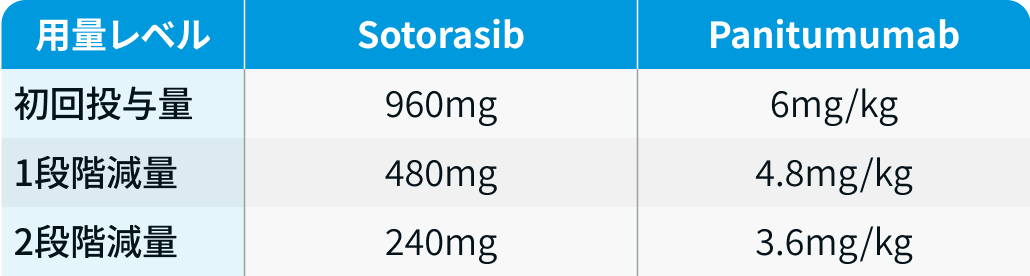 有害事象発現時は以下のとおり減量する。 2段階減量後も忍容できない場合は投与を中止。