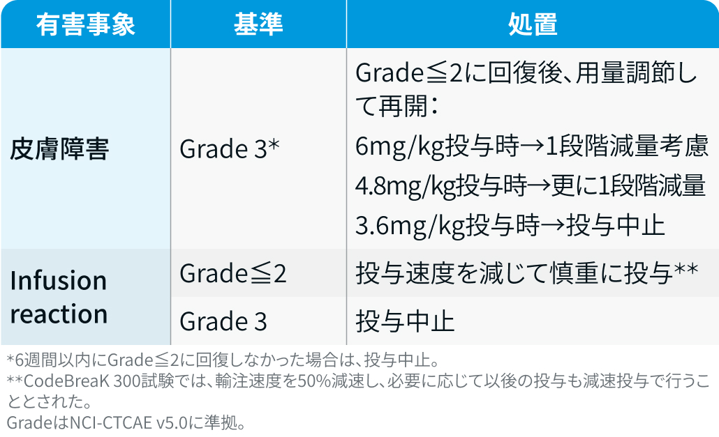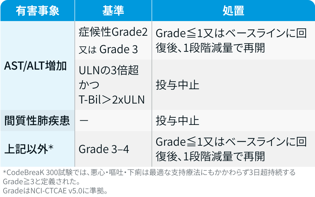 CodeBreaK 300試験³⁾では、 ソトラシブを休薬・中止する場合はPmabも同様に休薬・中止した。 一方、 Pmabを休薬する場合、 ソトラシブは臨床的に安全と判断されれば継続可能とされた。