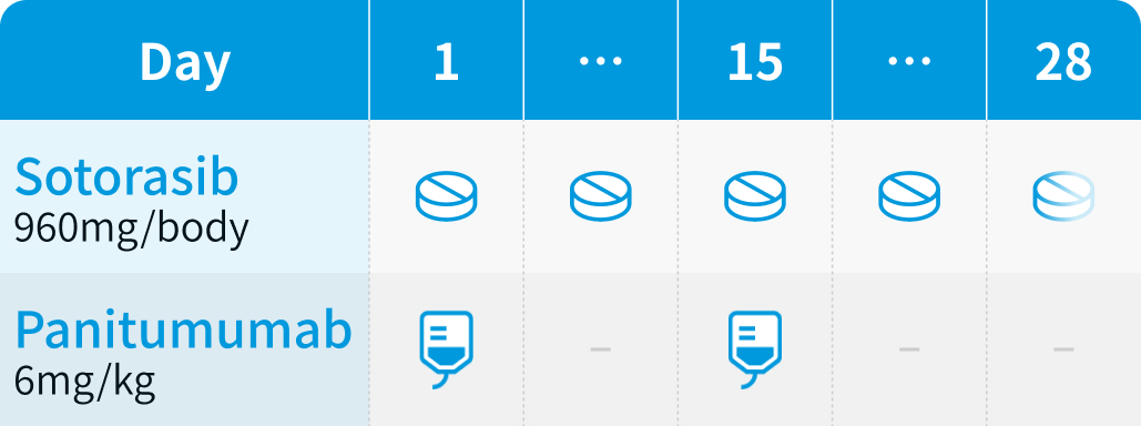 本レジメンは、 KRAS G12C変異陽性でフッ化ピリミジン系・オキサリプラチン・イリノテカンの前治療歴を有する患者が適応となる。